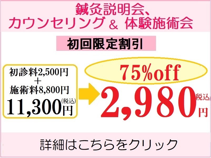 まず、下の「鍼灸説明&体験治療会」からお申込みください。